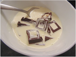 Mientras tanto, preparamos la cobertura que es muy rápida y sencilla. En un bol, ponemos el chocolate troceado. En un cazo ponemos a calentar la nata y, cuando empiece a hervir, retiramos. Añadimos al chocolate y removemos hasta que se disuelva por completo.